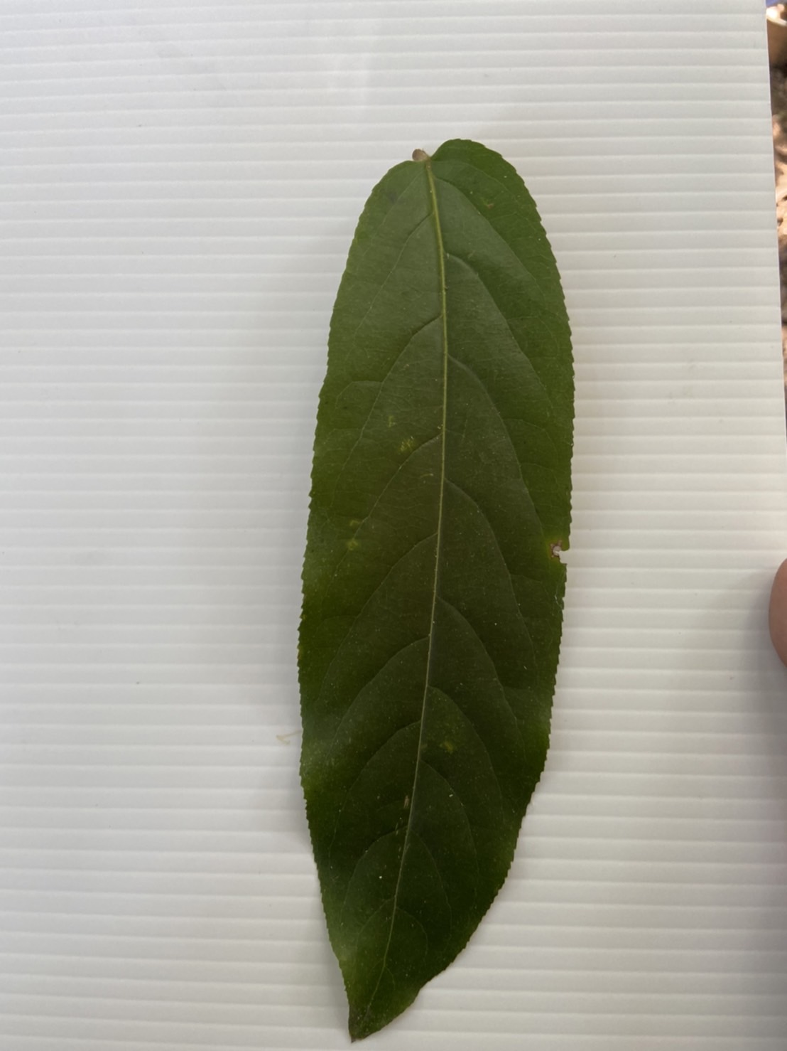 ใบเป็นใบเดี่ยว ออกเรียงสลับ ลักษณะของใบเป็นรูปรียาวขอบขนานหรือรูปไข่แกมรูปขอบขนาน ปลายใบแหลมหรือเรียวแหลม โคนใบมนกว้าง มักเว้าเล็กน้อยที่รอยต่อก้านใบ ส่วนขอบใบหยักเป็นถี่ตื้น ๆ แผ่นใบมีขนาดกว้างประมาณ 3-6 เซนติเมตร และยาวประมาณ 8-13 เซนติเมตร เนื้อใบหนา แผ่นใบเรียบ แผ่ หลังใบเรียบเกลี้ยงเป็นมันหรือมีขนเล็กน้อยที่เส้นกลางใบ ส่วนท้องใบมีขนสั้นขึ้นปกคลุมทั่วไป เส้นกลางใบเรียบหรือเป็นร่องทางด้านบน ด้านล่างนูนเห็นได้ชัด เส้นแขนงใบมีข้างละ 8-14 เส้น แผ่นใบมีต่อมเป็นจุดและขีดสั้น ๆ กระจัดกระจายทั่วไป เมื่อส่องดูกับแสงสว่างจะโปร่งแสงก้านใบสั้น ยาวได้ประมาณ 0.6-1.2 เซนติเมตร มีขนสั้นนุ่มหรือเกือบเกลี้ยง หูใบมีขนาดเล็ก ลักษณะเป็นรูปสามเหลี่ยม ขนาดประมาณ 1.5 มิลลิเมตร ร่วงง่าย